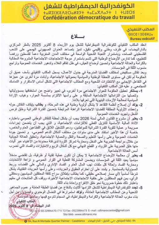 بيانات و بلاغات بلاغ المكتب التنفيذي للكونفدرالية الديمقراطية للشغل بتاريخ8 أكتوبر2025 أكتوبر 8, 20250 أقل من دقيقة شاركها فيسبوك تويتر واتساب مشاركة عبر البريد طباعة أكتوبر 8, 20250 أقل من دقيقة شاركها فيسبوك تويتر واتساب مشاركة عبر البريد طباعة شاركها فيسبوك تويتر واتساب تيلقرام مشاركة عبر البريد طباعة