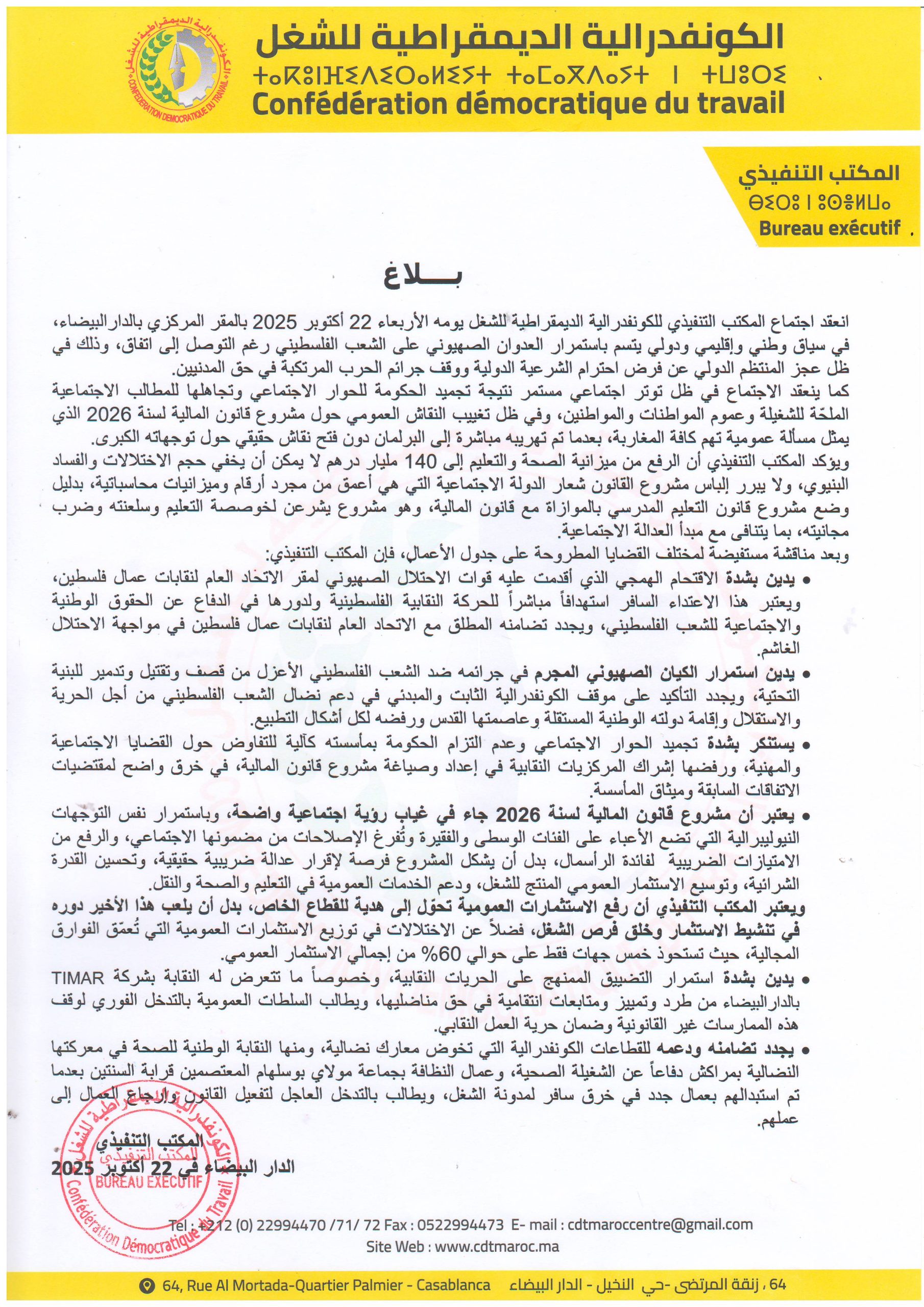 بيانات و بلاغات بلاغ المكتب التنفيذي للكونفدرالية الديمقراطية للشغل بتاريخ 22 أكتوبر2025 أكتوبر 24, 20250 أقل من دقيقة شاركها فيسبوك تويتر واتساب مشاركة عبر البريد طباعة أكتوبر 24, 20250 أقل من دقيقة شاركها فيسبوك تويتر واتساب مشاركة عبر البريد طباعة شاركها فيسبوك تويتر واتساب تيلقرام مشاركة عبر البريد طباعة