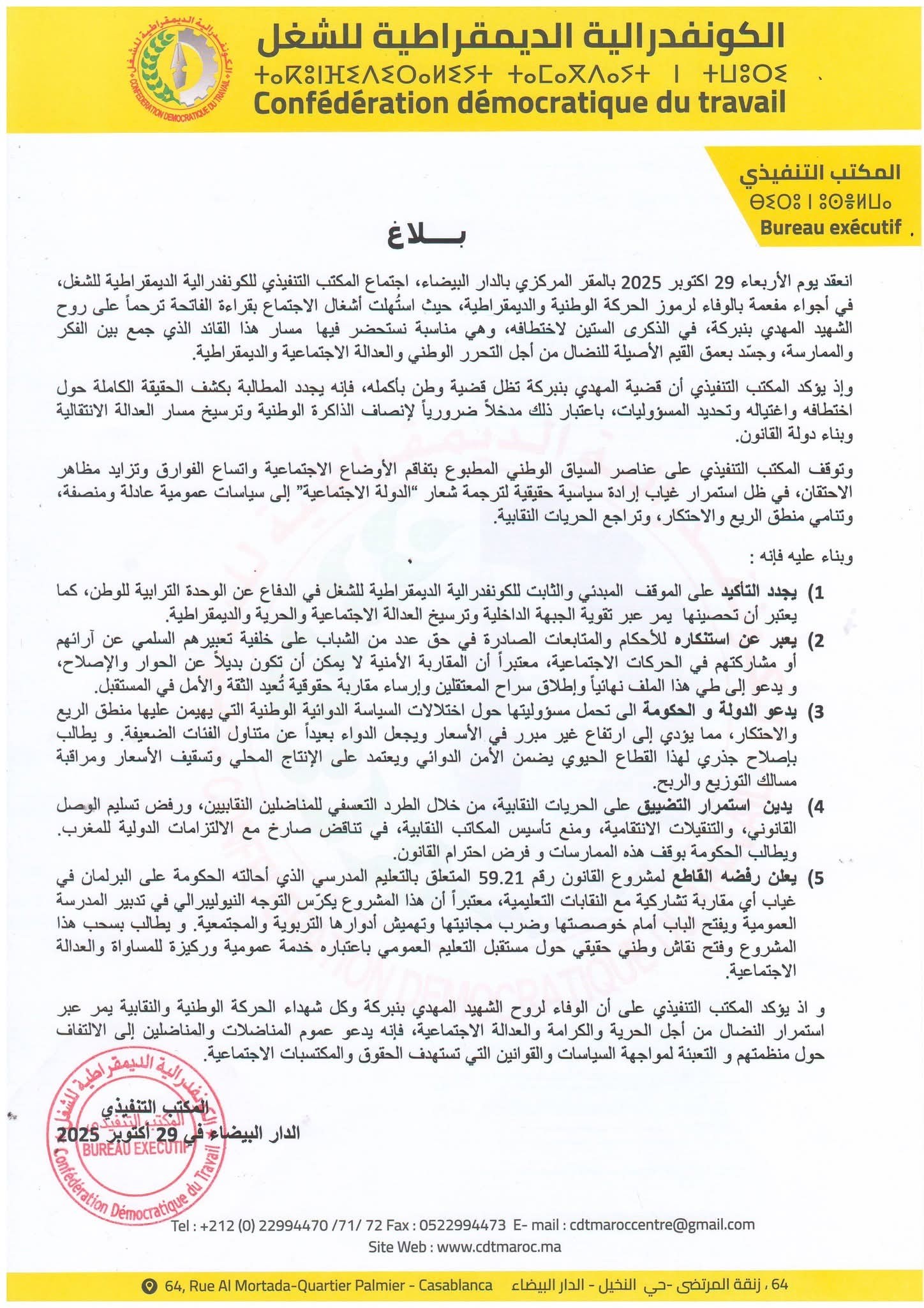 بيانات و بلاغات بلاغ المكتب التنفيذي للكونفدرالية الديمقراطية للشغل يوم الأربعاء 29 اكتوبر 2025 أكتوبر 30, 20250 أقل من دقيقة شاركها فيسبوك تويتر واتساب مشاركة عبر البريد طباعة أكتوبر 30, 20250 أقل من دقيقة شاركها فيسبوك تويتر واتساب مشاركة عبر البريد طباعة شاركها فيسبوك تويتر واتساب تيلقرام مشاركة عبر البريد طباعة