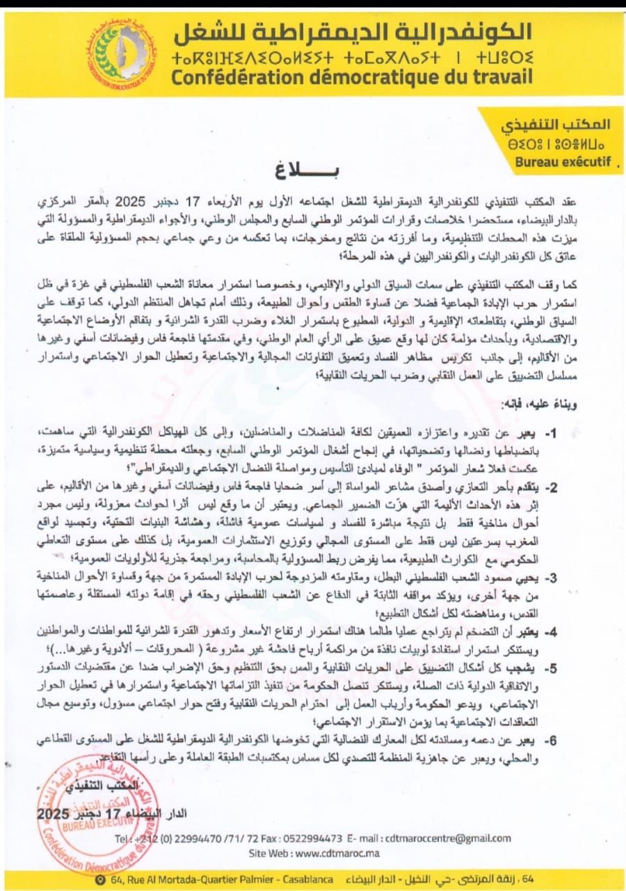 بيانات و بلاغات بلاغ المكتب التنفيذي للكونفدرالية الديمقراطية للشغل يوم الأربعاء 17 دجنبر 2025 ديسمبر 20, 20250 أقل من دقيقة شاركها فيسبوك تويتر واتساب مشاركة عبر البريد طباعة ديسمبر 20, 20250 أقل من دقيقة شاركها فيسبوك تويتر واتساب مشاركة عبر البريد طباعة شاركها فيسبوك تويتر واتساب تيلقرام مشاركة عبر البريد طباعة